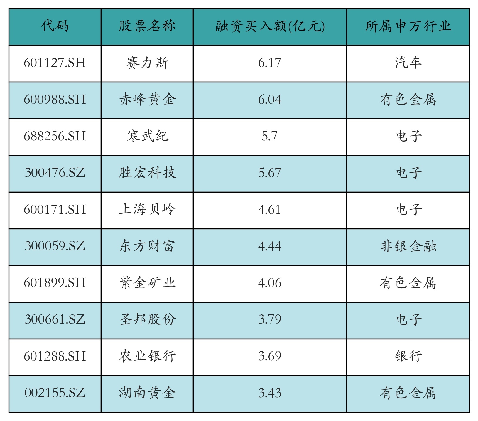 两市共有3423只个股有融资资金买入,其中赛力斯、赤峰黄金、寒武纪排名前三,买入金额分别6.17亿元、6.04亿元、5.7亿元。融资买入额前10个股详情见下表: