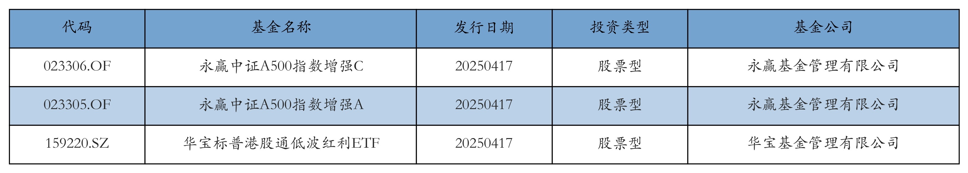 昨日有3只新基金发行,分别为:永赢中证A500指数增强C、永赢中证A500指数增强A、华宝标普港股通低波红利ETF,详情见下表: