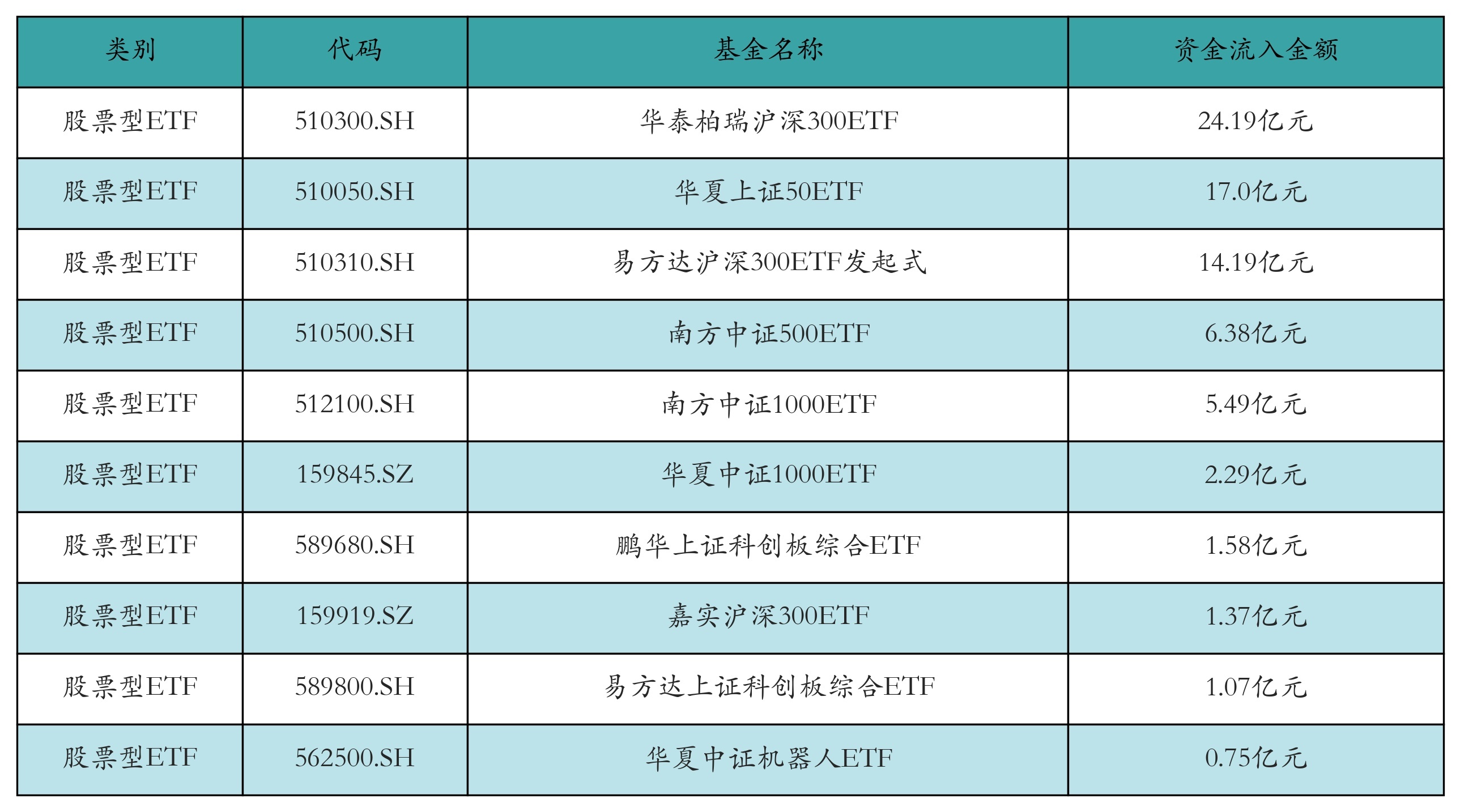 昨日股票型ETF资金流入最多的3支ETF及其流入金额分别为:华泰柏瑞沪深300ETF(流入24.19亿元)、华夏上证50ETF(流入17.0亿元)、易方达沪深300ETF发起式(流入14.19亿元)。资金流入前10详情见下表: