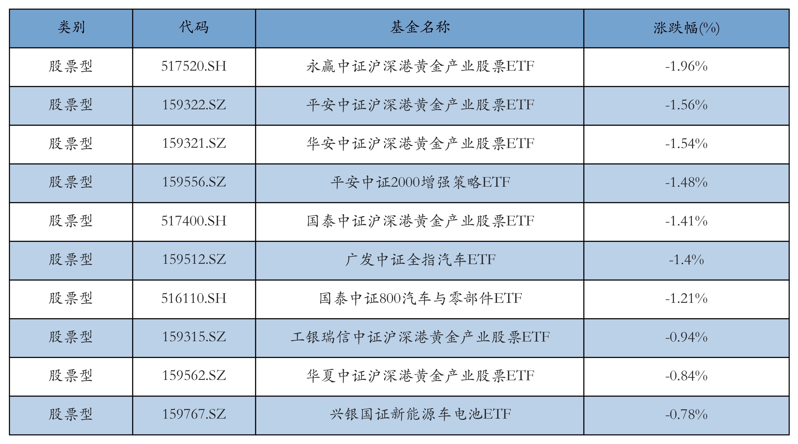 昨日股票型ETF跌幅最大的3支ETF及其收益率分别为:永赢中证沪深港黄金产业股票ETF(-1.96%)、平安中证沪深港黄金产业股票ETF(-1.56%)、华安中证沪深港黄金产业股票ETF(-1.54%)。跌幅前10详情见下表: