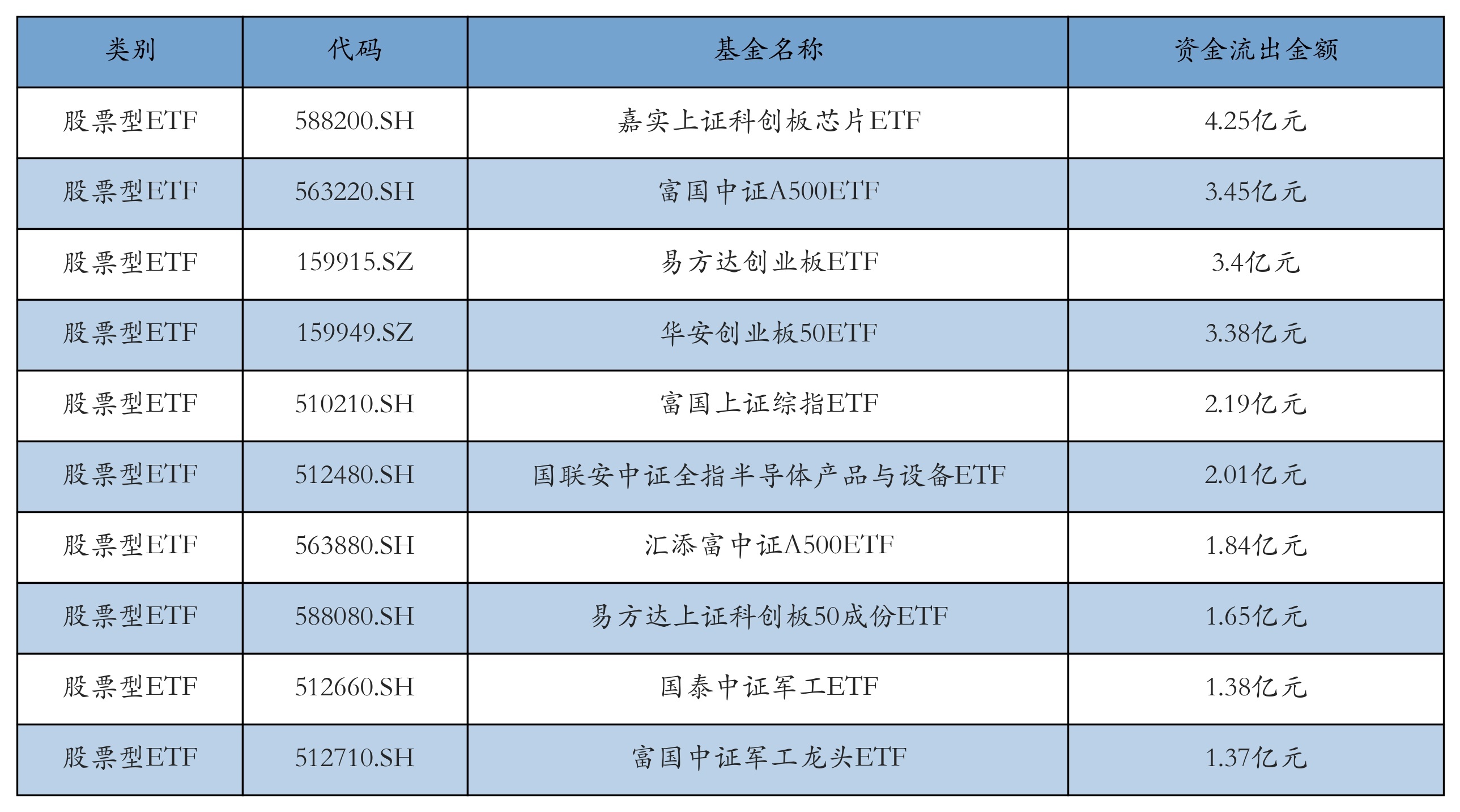 昨日股票型ETF资金流出最多的3支ETF及其流出金额分别为:嘉实上证科创板芯片ETF(流出4.25亿元)、富国中证A500ETF(流出3.45亿元)、易方达创业板ETF(流出3.4亿元)。资金流出前10详情见下表: