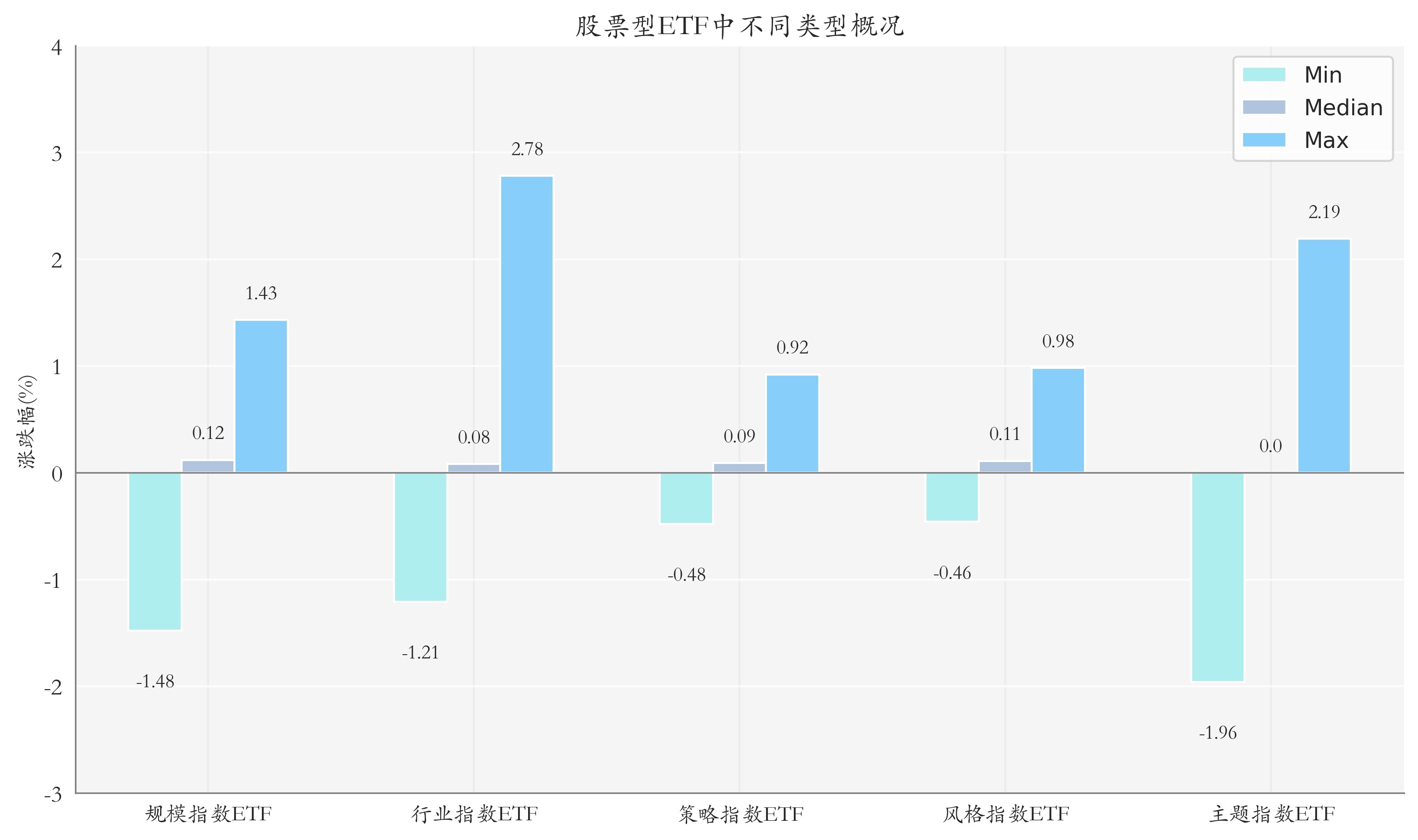 昨日股票型ETF收益率中位数为0.09%。其中按照不同分类,规模指数ETF中华夏上证科创板200ETF收益率最高,为1.43%;行业指数ETF中华宝中证800地产ETF收益率最高,为2.78%;策略指数ETF中华夏创业板低波价值ETF收益率最高,为0.92%;风格指数ETF中建信上证智选科创板创新价值ETF收益率最高,为0.98%;主题指数ETF中银华中证内地地产主题ETF收益率最高,为2.19%。