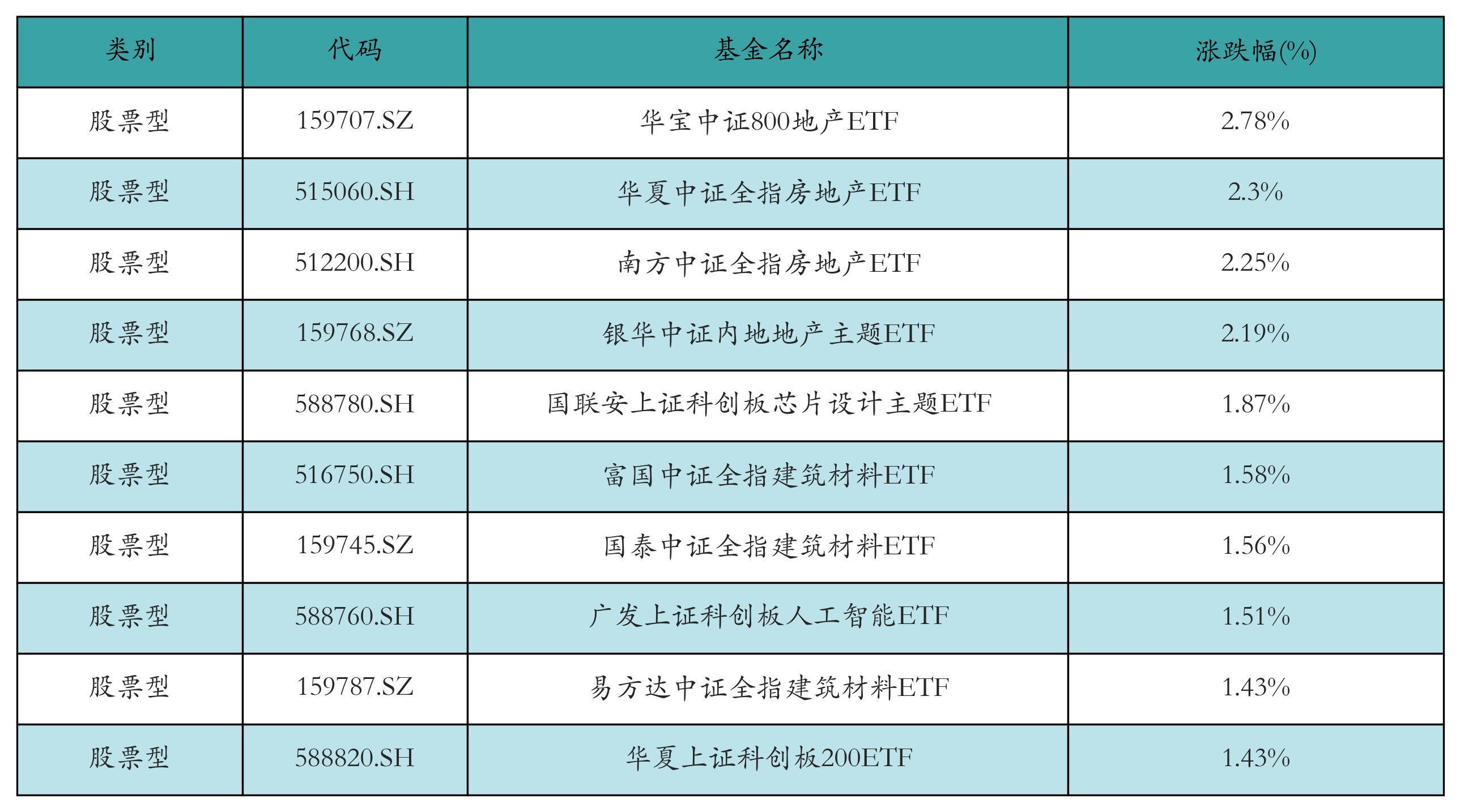 昨日股票型ETF涨幅最高的3支ETF及其收益率分别为:华宝中证800地产ETF(2.78%)、华夏中证全指房地产ETF(2.3%)、南方中证全指房地产ETF(2.25%)。涨幅前10详情见下表: