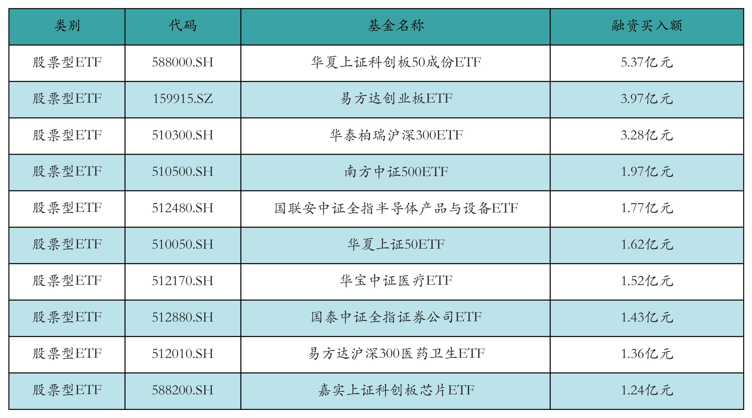 昨日股票型ETF融资买入额最高的3支ETF及其买入金额分别为:华夏上证科创板50成份ETF(5.37亿元)、易方达创业板ETF(3.97亿元)、华泰柏瑞沪深300ETF(3.28亿元)。融资买入额前10详情见下表: