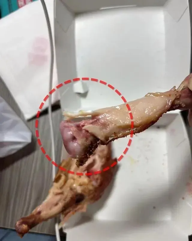 2023年7月20日,山东青岛的消费者杨先生通过外卖平台在塔斯汀·中国汉堡(香江路店)点了一人份的套餐,吃了一口却发现鸡腿上的肉还没熟。“我咬了一口开熏火焰鸡腿感觉口感不对,掰开一看,发现鸡腿里面的肉有生的地方,没有完全受热。”杨先生顿时感到恶心、呕吐。